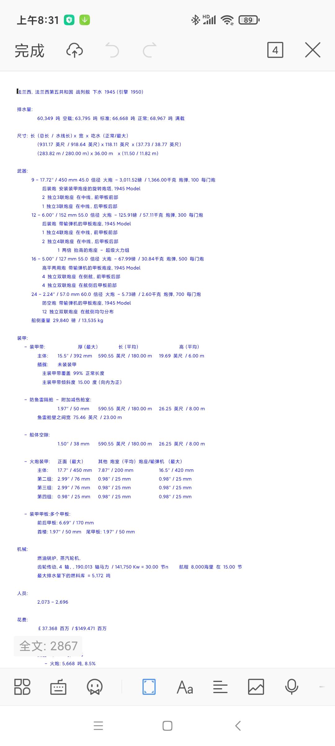 数据有两个版本,主要差别是装甲甲板厚度,还有有无按照历史推演出的艏艉次装的区别。但由于模拟结果是法兰西核心区长度受限而非吨位不足,因此装甲甲板厚度较低版本的多余吨位被计入了配件,辅机和结构——就是说,对动力等没什么影响。