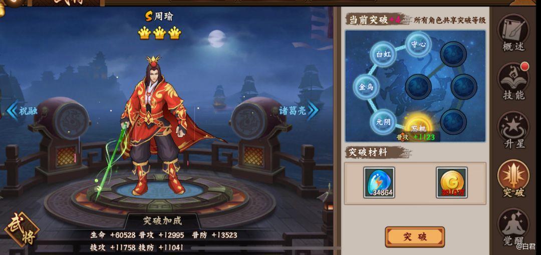 武将突破颜色依次是白、绿、蓝、紫,土黄、青粉,金、大红、亮黄、珊瑚色,每种色彩则代表着每一轮突破的完成,随着颜色的变换、在武将突破的过程中,突破1至8等级消耗金币与突破石,突破第9等级则需消耗元宝,突破9等级后又会重新到下一轮,随着突破等级的提升,武将所获得的基础属性也会得以增幅。