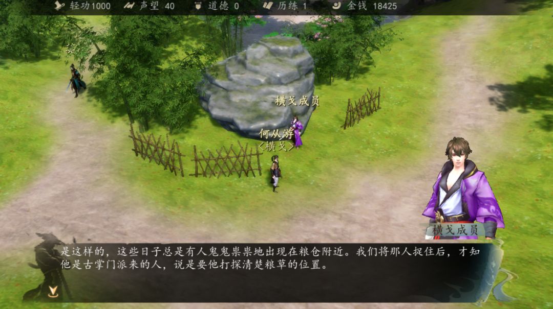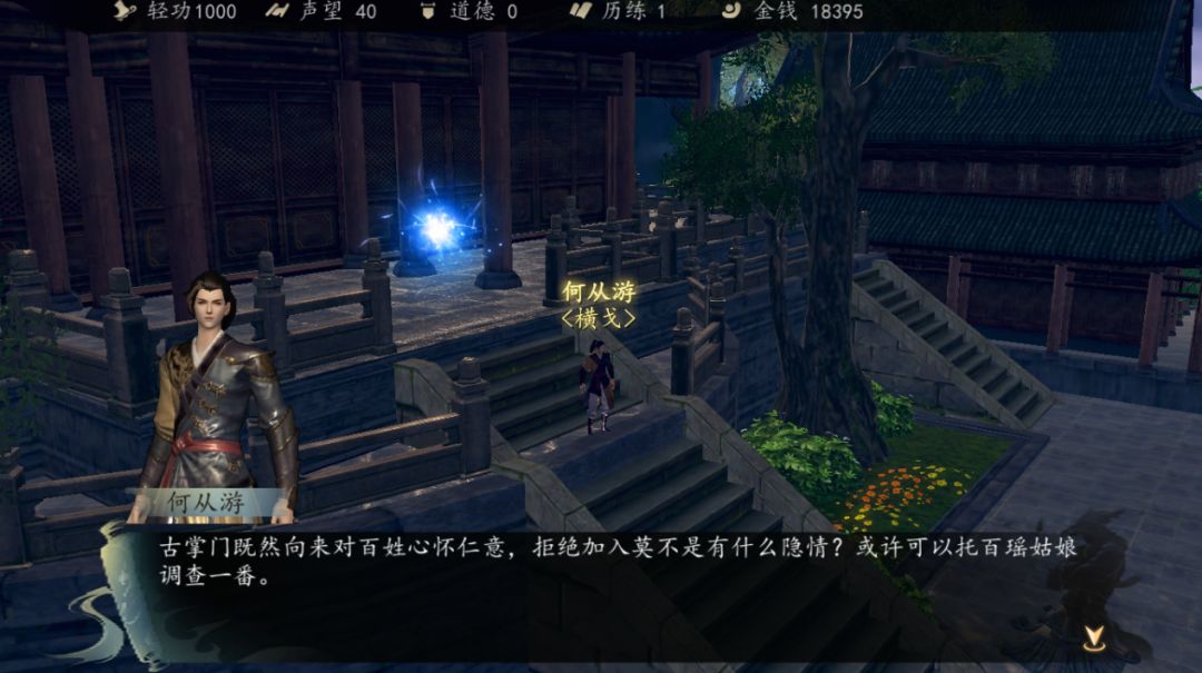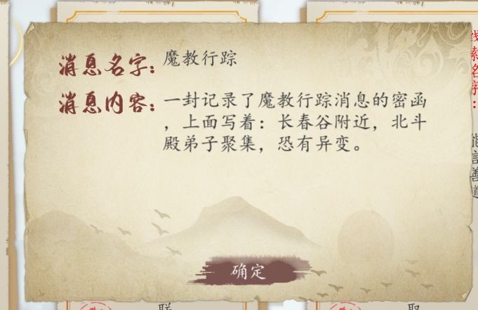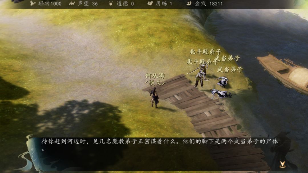 然后去北斗殿附近看到许多北斗殿的弟子聚集,准备攻打武当,主角说话触发战斗,打赢之后,去找百瑶获取“魔教行踪”的消息。