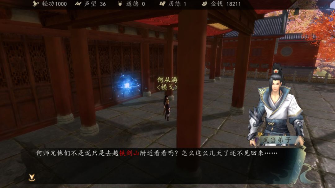 继续坚持,触发对话,得知武当被魔教偷袭,主角帮忙解决。走出主殿触发对话。