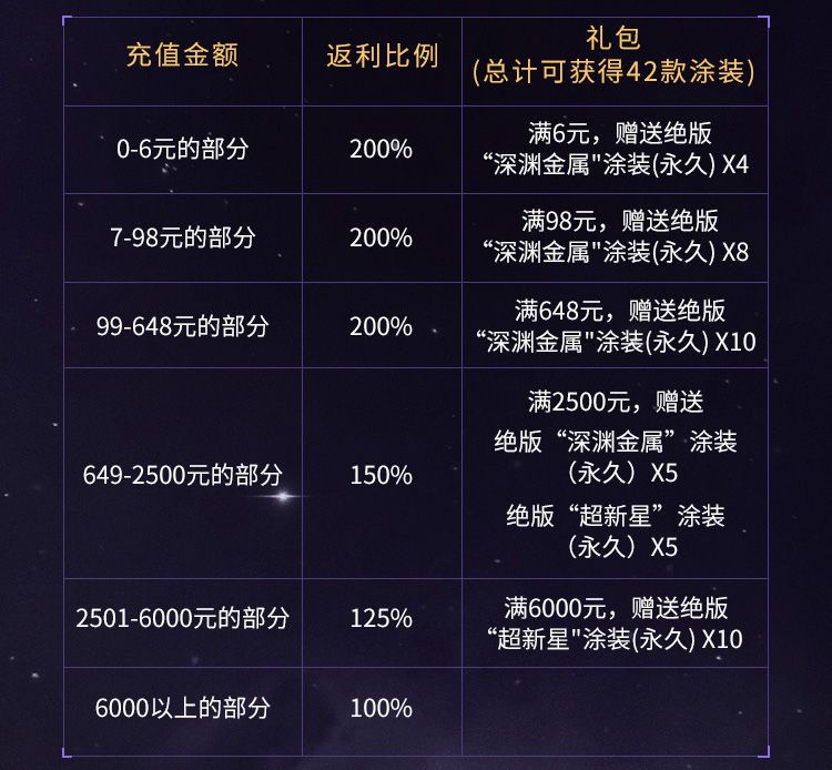 【终极跃迁测试】推出两个系列绝版涂装,未来官方将不再发售,玩家之间可自由交易。测试期间的任意充值金额(如购买量子元和欧米伽克隆),将按照相应比例在公测时进行返还,返还奖励根据充值金额叠加获取。具体返还比例和礼包如下所示: