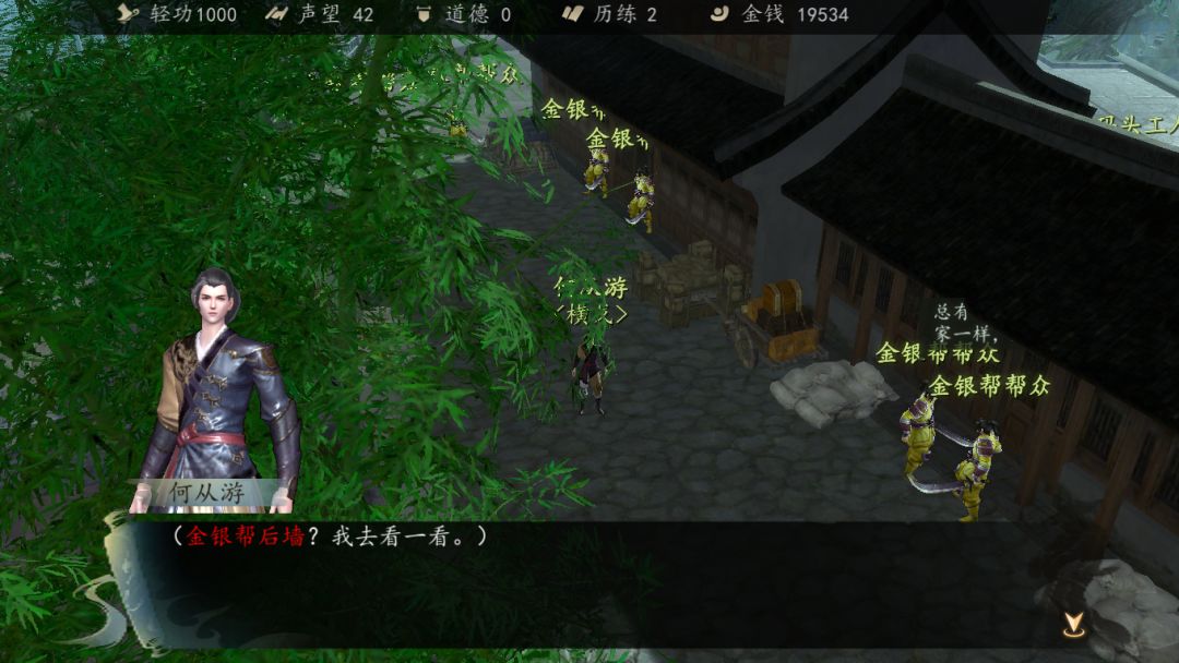 选项3.另寻他法,听到几个金银帮弟子谈论,有物资放在帮派后面。