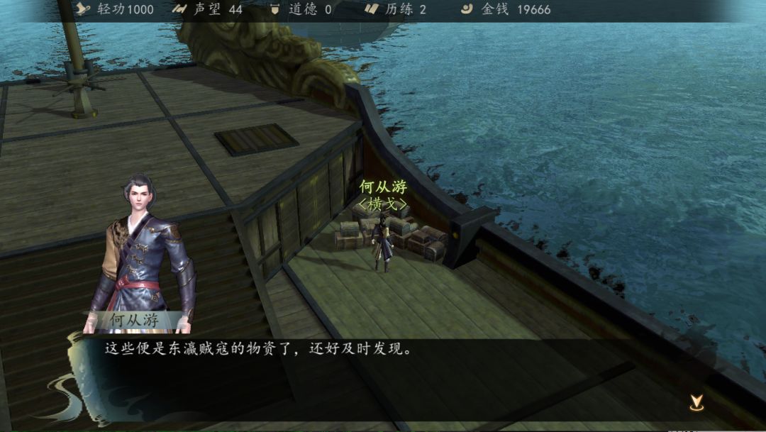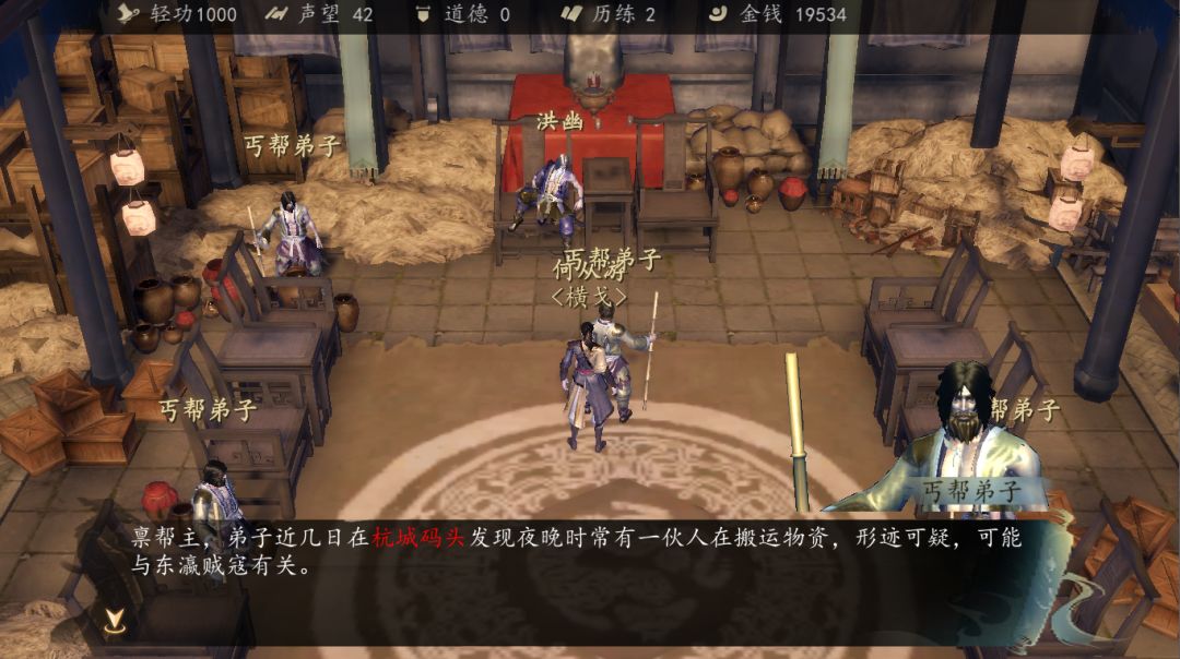与洪幽对话得知东瀛贼寇活动频繁,在杭城码头搬运物资,主角前去销毁。