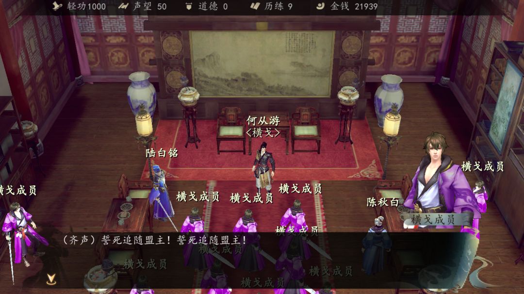 与上杉秀吉对话,被他们逃跑了,发现留在桌子上的作战图,得知他们的计划,返回丐帮与洪幽商量。