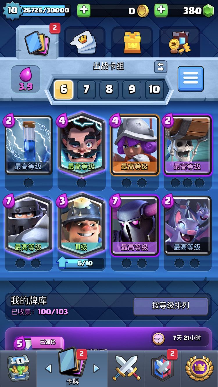 我在这里给大家提个醒,不要跟我一样只升级一套卡组,这样即使你能全部满级,对手也都是满级而且高你国王塔等级,我匹配的百分之80都是11级国王塔,百分之10是12级,百分之10跟我一样是10级,平常打天梯经常因为对面比我多一点血而输,所以,不要再在乎等压了,等压的原因是你的国王塔等级与你的杯数不匹配只要你技术足够高,无论你卡等是怎样都会被不同形式的等压(楼主上个赛季6000杯子,不算强,但是用10级国王塔一直打11级已经觉得很不容易了
