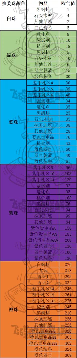 这里总结了一份欧气值对应数值表,大家可以观摩观摩。