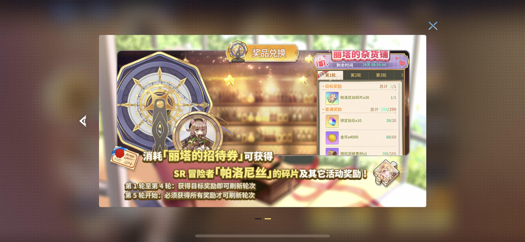 有小伙伴说抽到两张金票就会重置,可活动公告不是这么写的“第5轮开始:必须获得所有奖励才可刷新轮次。”况且我的图是按照抽奖顺序截的,到第二张图就已经两张金票了,可是抽到第三张图才结束。所以这个说法不成立。