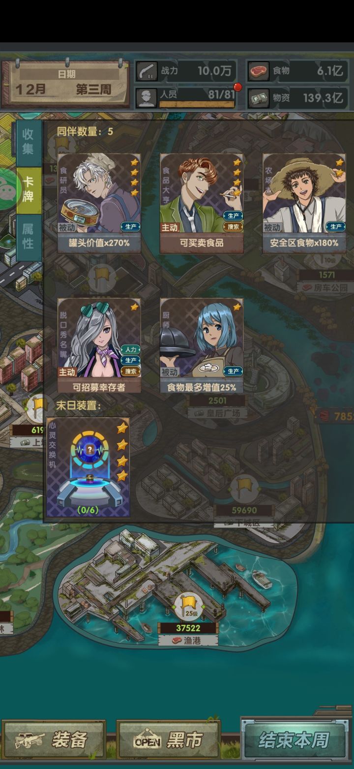 4、头两个星期,通过黑市和罐子哥卖罐头,尽量凑够战力打农场,只留一个兵探索农场,其他继续采集食物做成罐头换钱。