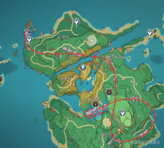 俗话说打蛇打七寸,因为那是蛇的心脏部位,能有效致死。在稻妻,雷神用无想一刀,将蛇连同山岳劈成了两段。其景甚为壮观。但我们观察地图,就可以发现,雷神劈蛇的位置,似乎并不是蛇的七寸,而是蛇的中后段: