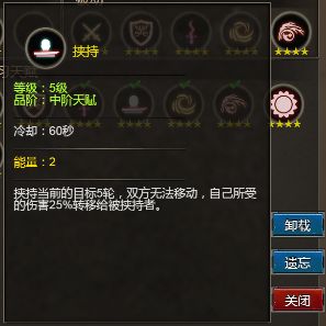 挟持:挟持当前目标5轮,双方无法移动,自己所受伤害25%转移给被挟持者