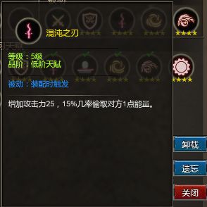 混沌之刃:提升攻击力25点,攻击时15%几率偷取对方1点能量