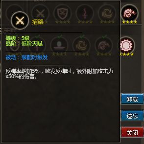 招架:反弹几率提升5%,触发反弹时附加自身攻击力x50%伤害