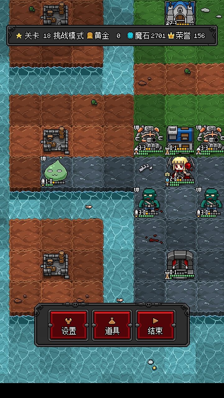 第三回合,蝙蝠已经就位,为了把对面的城敲了出了个投矛手,旁边建设好的史莱姆踩开召唤位,围上来一顿炼金;到这里可以说这关已经基本完事,四个史莱姆只要一个活着,下一轮中间也是我们的,或者也可以鸡贼点不开骗对面行动点: