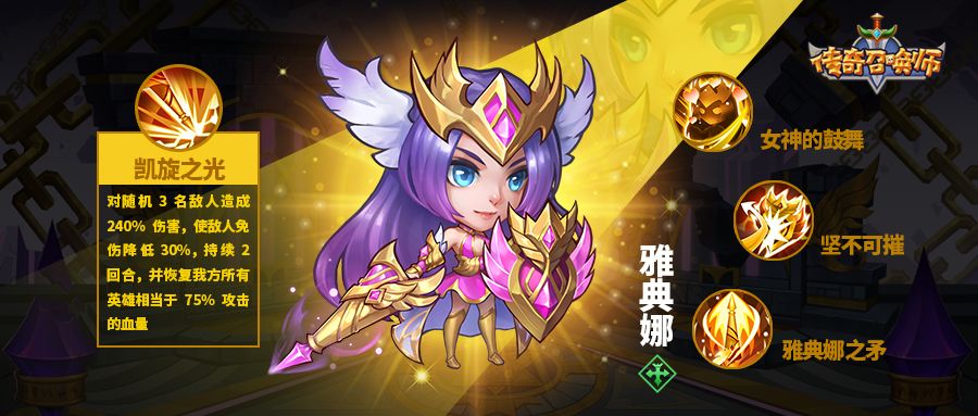 西方神话中最具人气与魅力的神祇之一,智慧与战争女神——雅典娜,正式降临。雅典娜端庄貌美,明艳动人,是一个年轻有力量的女神,同时还拥有众多才艺,有极多的信徒和守护者,战斗时,她一般不需要亲自动手。周年庆期间降临勇者大陆,所有召唤师可进行召唤或直接兑换。
