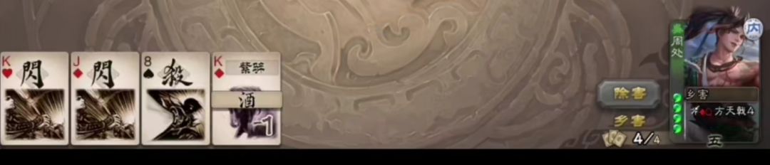 “除害”弥补了“乡害”无法上装备的缺点,但要求是拼点赢,且造成伤害。拼点赢的要求不难达到,减了手牌上限,必然留的是key牌,反向思维如果对面留大点,那干扰其存牌,当作一拆也不亏。造成伤害,如果敌人是在你旁边,那配合减手上限+拼点,倒是不难达到,尤其对于三血将,这一番下来只能留一张牌,更容易了。