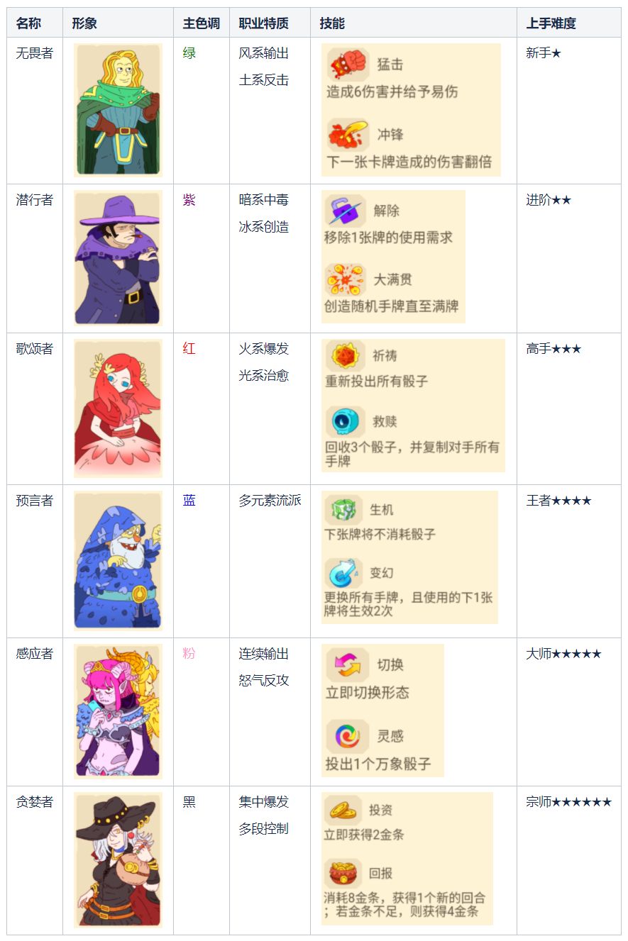刚才已经提到的元素师,目前总共有六位,分别代表着不同的职业玩法和技能特质,如图: