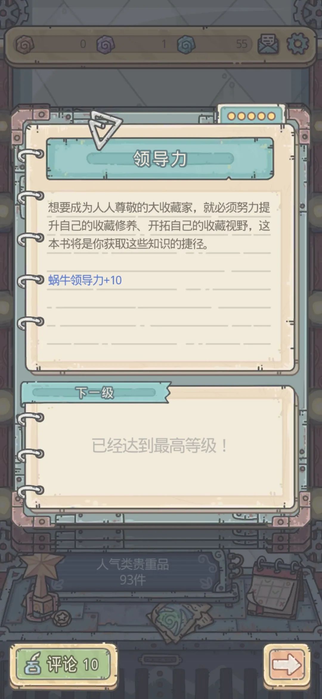 在收藏家天赋页面,可以选择升级最右边一列的领导力等级,每升一级提升2领导力。不过这里建议在左边的基因研究速度毕业后慢慢开发右边的领导力,毕竟是个挂机游戏,资源收益还是很重要的。But!右边的第一行还是要点的,这轻松10领导力不香吗?