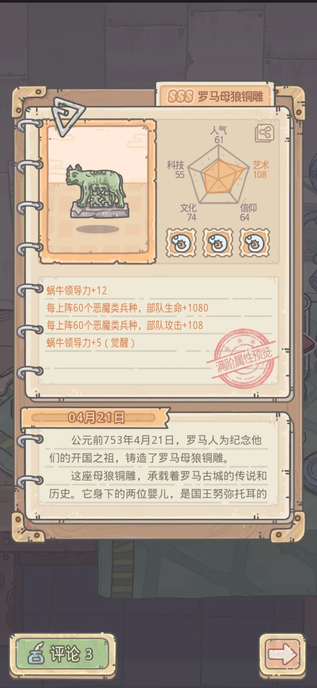 光环:每上阵60个兵种,部队攻击+81每上阵60个兵种,部队生命+810;蜗牛领导力+5 /7 /9 /12