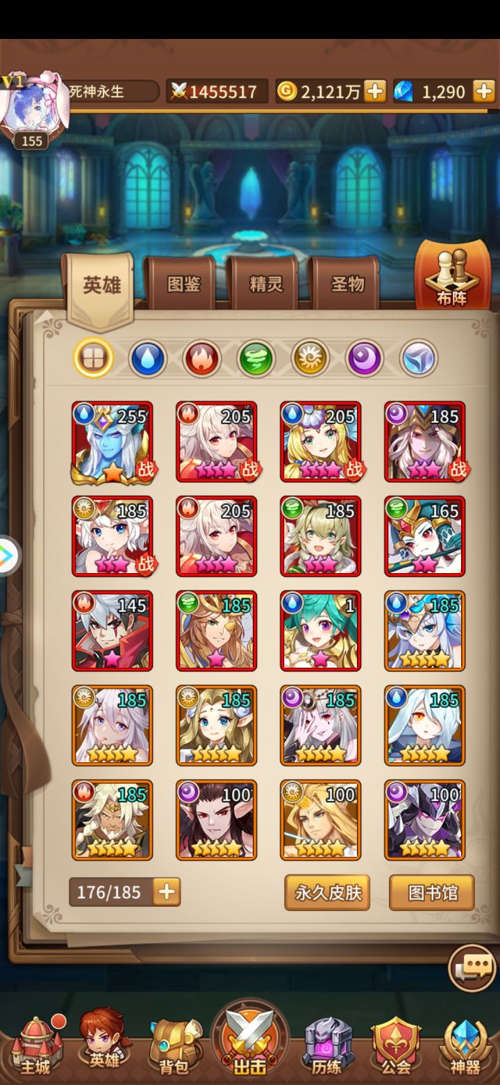 玩了两年,中间退过半年的大号。唉,之前刚玩的时候光暗都不算很突出,而且总共也就那么几十个人物,那时候不会玩,把好的五星英雄都给融了。