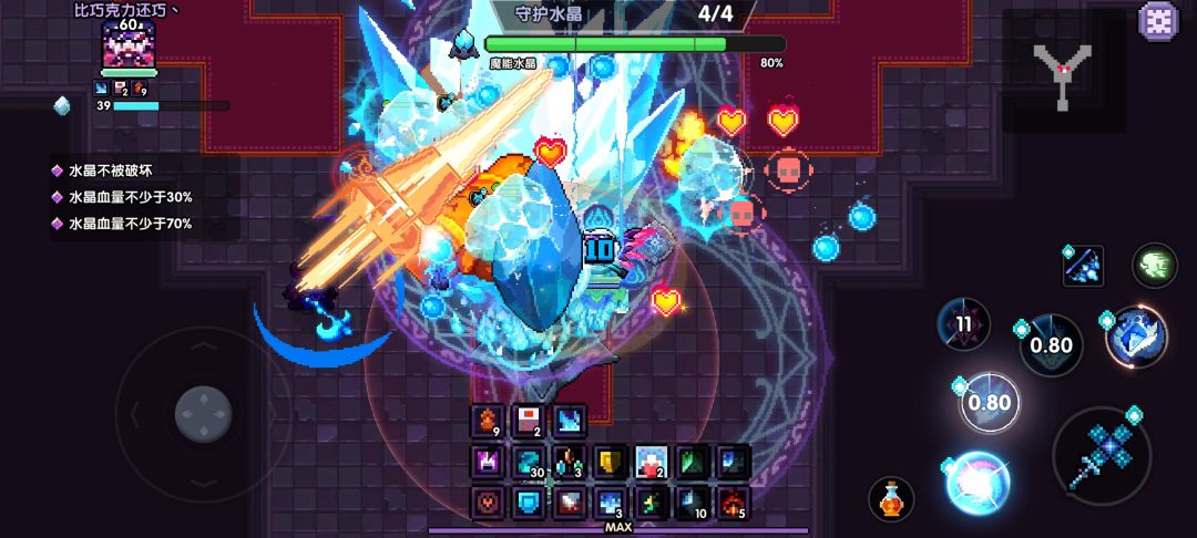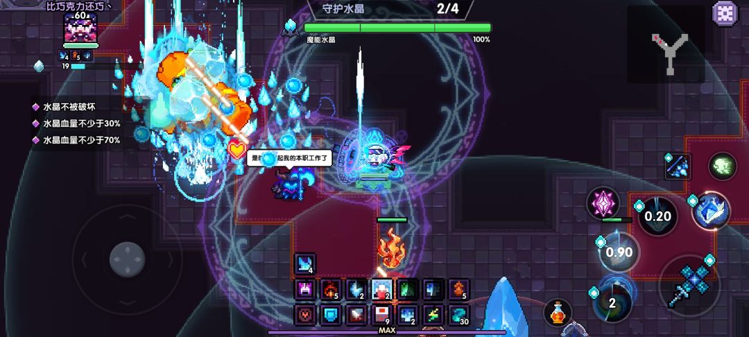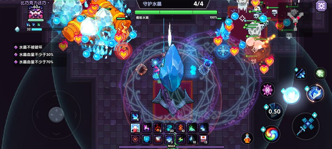 先来讲讲这个水晶的机制吧,当掉到70血和30血时会释放冲击波清理全屏怪。所以就算你伤害不足以应对后面两波怪的突击,也可以依靠水晶的自我保护机制通关。