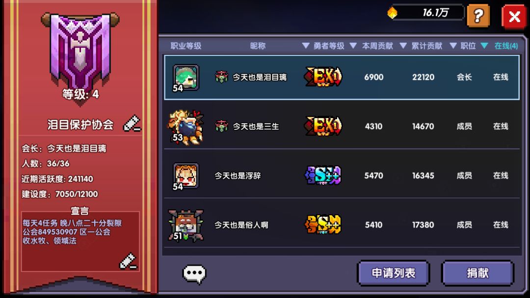 当然不同的公会会有不同的要求,例如每周贡献要求,捐钻要求,任务要求,这些东西在你入会前一定要仔细查看自己是否能达到,因为公会不只是你一个人在努力,而是一个集体,没有遵守集体要求可是会被踢出公会的噢!还有重要的公会群也是一定要进,因为公会管理会在里面发表每个活动的通知,裂隙BOSS的配队之类的,每个公会的活动时间不同也是需要注意的!