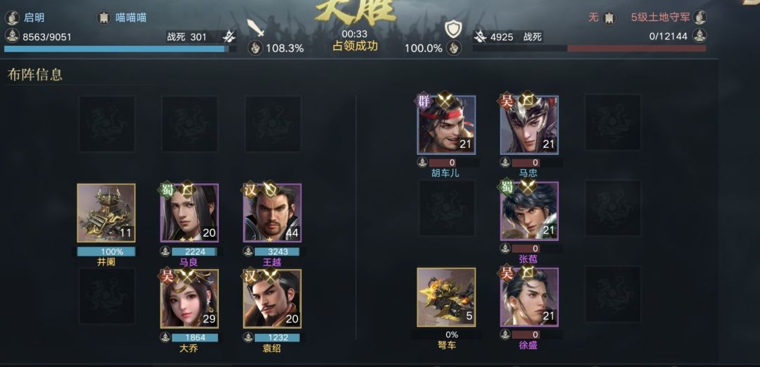 可以看到这个时候,王越主坦,承受了胡车儿,马忠,张苞三人的伤害。上方士兵战损显示受伤士兵极少,这表示治疗足够。关键问题在于我无法先击杀徐盛,这导致本轮承受过高。损失士兵极多。