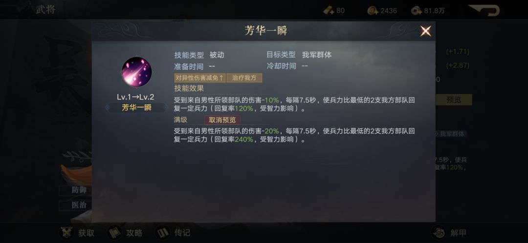 这个技能好玩的一点在于,理论最大治疗量600%,高的吓人。但注意图中“兵力受损”四个字。注意看战报的主公,应该会发现,士兵会在反复治疗中损失,这时候士兵依旧是受损的。但战损士兵又不能接受治疗复活。于是卢植老先生华丽丽的奶了4个0。