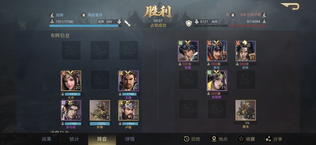 缺点②指向本阵容的根本缺陷:无绕后能力。这一能力只能通过特殊宝物或后排输出武将略作弥补。这一情况战报如图: