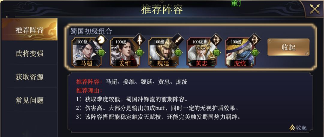 1> 获取难度较低,蜀国冲锋流派的前期阵容;