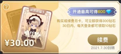 30元即可开通钻石月卡,购买后立即到账300钻石,购买后30天内,每日登录可领取10钻石,最高可获得600钻石。