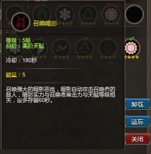 召唤暗影:召唤强大的暗影恶魔攻击目标,暗影恶魔的实力和魔击和天赋等级关联,暗影恶魔最多存在60秒