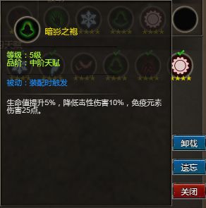 暗影之袍:生命值提升5%,降低毒性伤害10%,免疫元素伤害25点