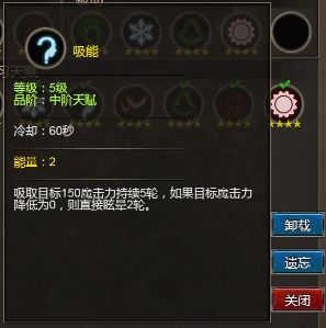 吸能: 吸取目标魔击持续5轮,目标魔击低于0,则眩晕2秒。