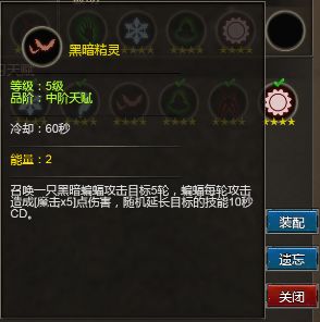 黑暗精灵:召唤一只黑暗蝙蝠攻击目标5轮,蝙蝠每轮造成【魔击x5】伤害,随机延长目标的技能10秒冷却时间