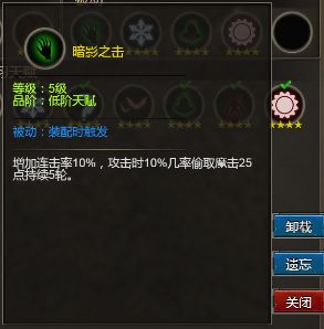 暗影之击:提升连击率10%,攻击时偷取魔击25点,持续5轮