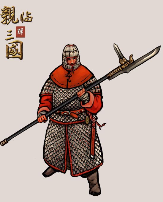 之后,睿哥又邀请了他的好友火哪吒。一开始想一起画人物立绘。可惜,碍于绘画风格没能成事。但火哪吒有一个画三国时代特种兵的爱好,也陆陆续续画了几幅。我觉得特别好,写实里风格。我又厚着脸,让他把在画的那套士兵立绘画给我。早在一年多以前,20张士兵立绘就画好了。这里放一张 “仪仗队”大戟士立绘。