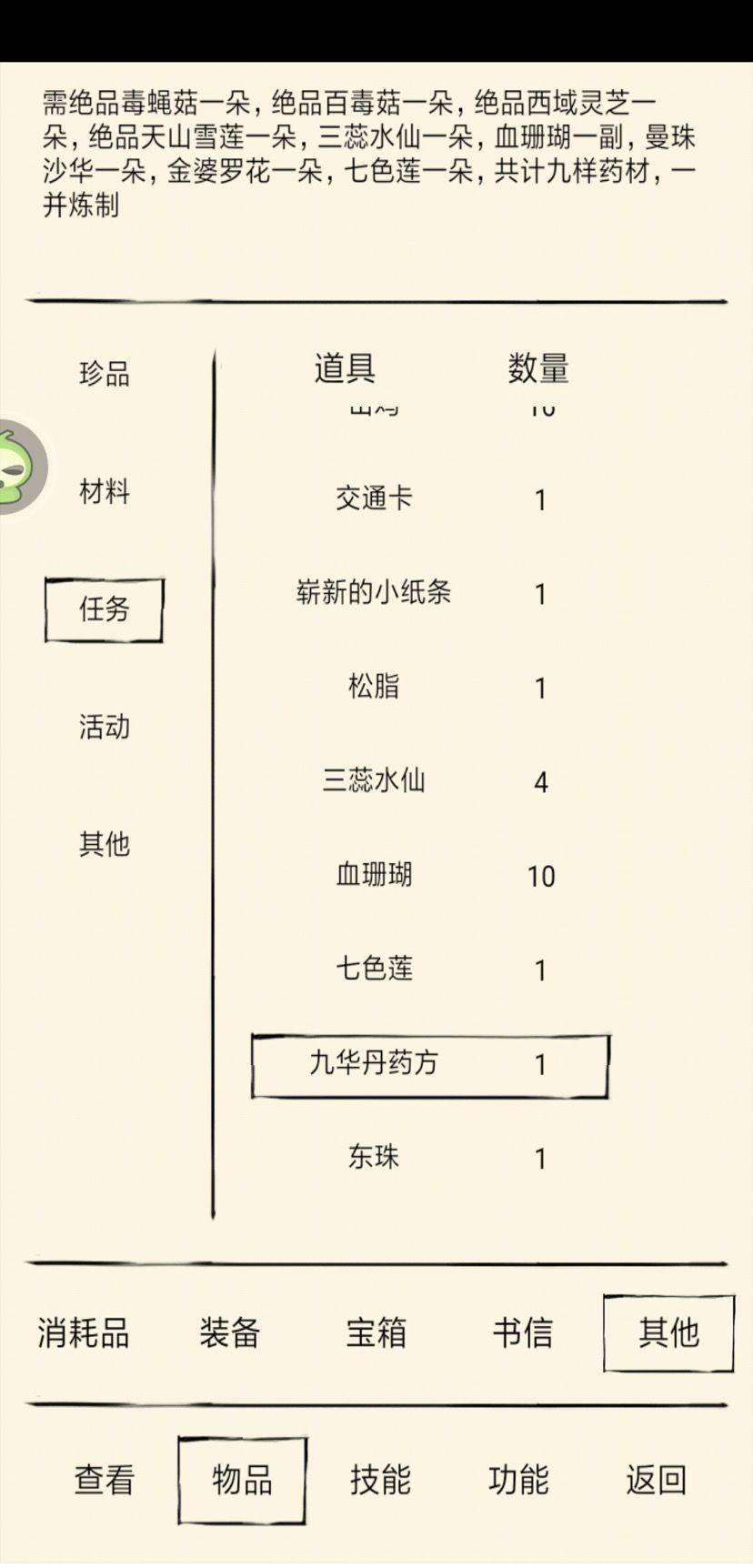 轮回带不走且有用的就是任务物品栏里面的一些东西,比如娶射雕大侠用的山鸡,和娶蓉儿用的东西如下图