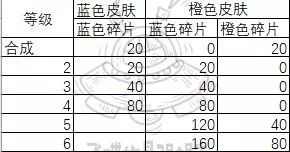 不难从表中看出,橙色皮肤所加成的都是元素伤害,效果远大于蓝色皮肤的加成,因此,有橙色皮肤就应当升级橙色皮肤,那必然又带来一个疑惑,皮肤升级要多少碎片呢?要橙碎还是蓝碎呢,本着为蜗爷排忧解难到底的原则,下面为蜗爷奉上升级消耗图