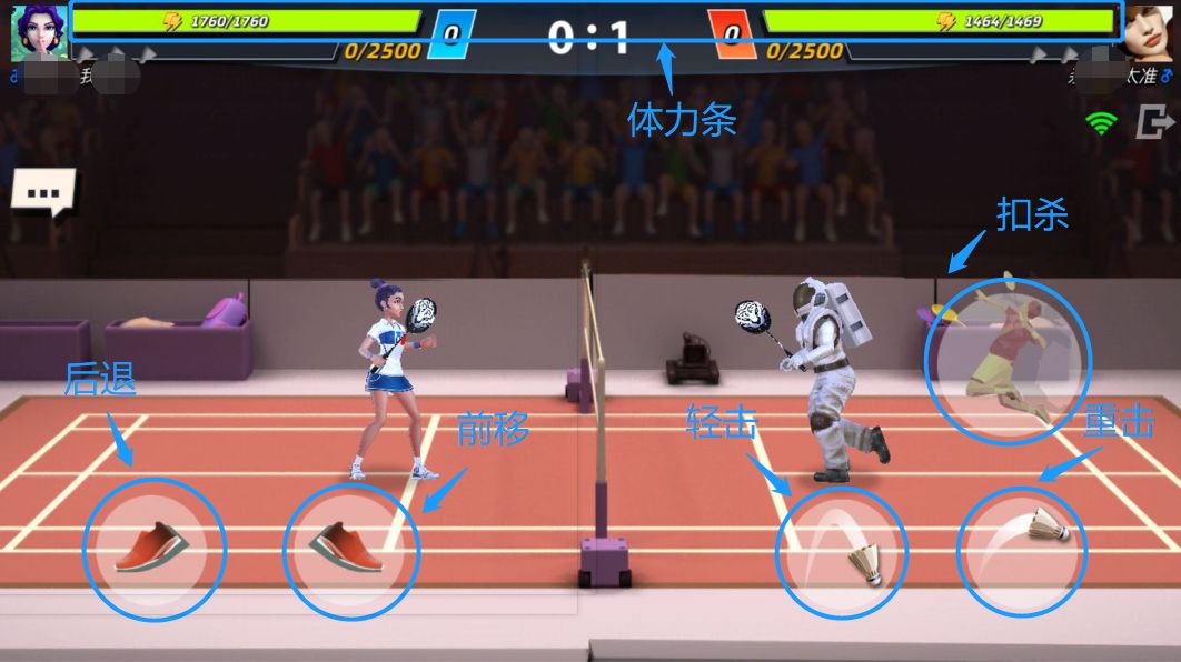 游戏操作主要为五个键:左边为移动(后退、前移),右边为击球键(轻击、重击、扣杀)。