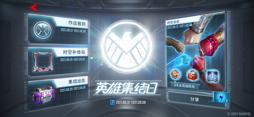作战报到,累登7天领取丰厚物资;集结战场,完成每日任务获得备战物资箱,开箱即可获得英雄线索、无畏之石、金币等奖励;完成对局后可随机获得补给,同时也可以与好友相互赠送或索要,每凑齐并消耗完整一套补给即可兑换奖励,凑齐5次后还能获得限定奖励【2021英雄集结日头像框】!