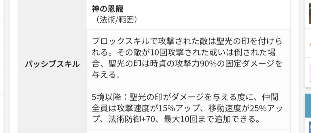 被动(法术,范围):被方块技能攻击的敌人会被打上圣光之印。当其敌人被攻击10次或击倒时,圣光之印会(对所有敌人)造成时贞攻击力90%的固定伤害。