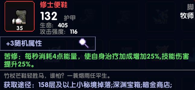 由于藏宝图带来的多一次普攻,我们头部就可以选择牧师神器宗师之冠。因为我们选择的是单穿,所以在衣服上我们选择防护服。鞋子最好是选择坚定步伐,当然,如果没有的话也可以选择修士便鞋