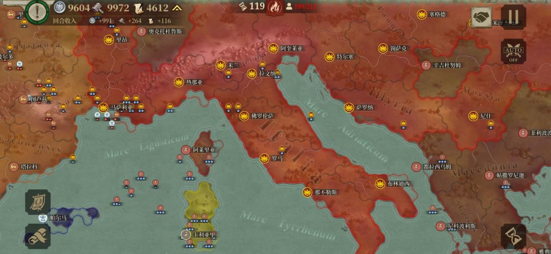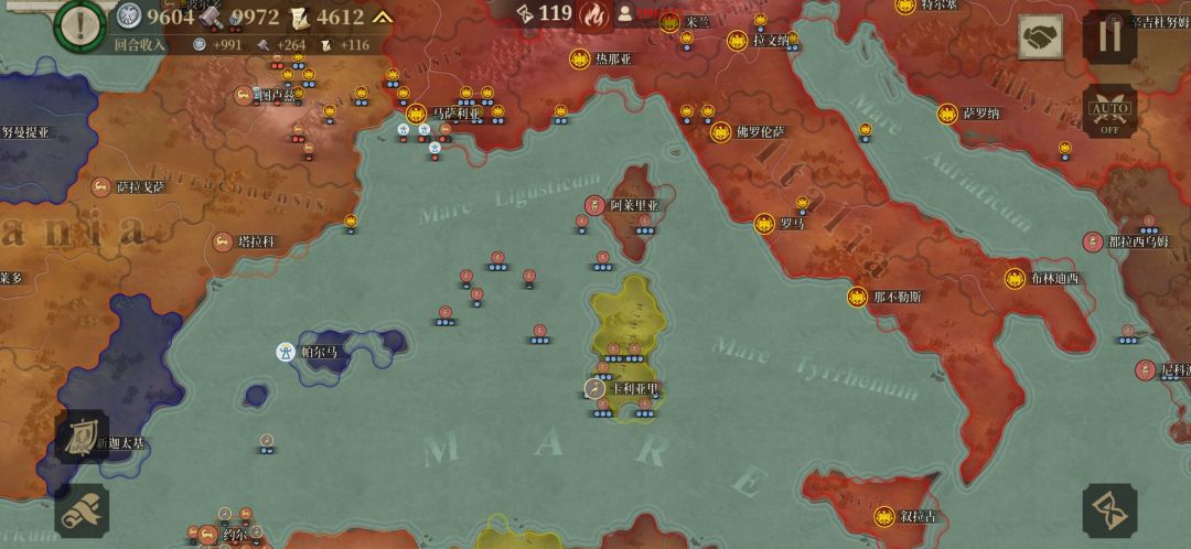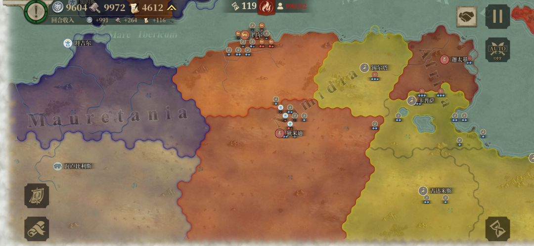 流氓国刚开始选择了迦太基,被我和罗马团灭了,打到现在还剩70多个回合的时候,大概六七十回合的时候就是这边只剩罗马,我和昔兰尼,那边只剩迦太基和图,中立国倒是一直都没啥情况。我现在到100多,回合上下两边还卡这附近没动,中立国我拉他两次投靠我们这边,现在我对他只有宣战选项,他连一个城都没给我打下来。说实话,刚开始六七首歌玩到后期,我看了就上下两面,一直推呗,大家经济全都几千,我就直接挂机,挂到90多回合是我感觉不对啊,这好像打不动了,然后仔细看一下,对面蛮族和战象,只能出投石跟神射,才能应付得了吧?但是貌似我们这边ai全自动重甲,加上罗马军团,根本只能靠命填,同盟离战线实在是太远了,我派兵又不方便,我又寻思了一下同盟的土地,好像有点少了,所以……
