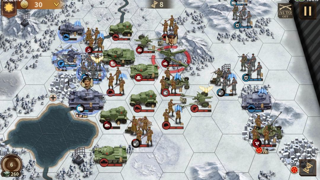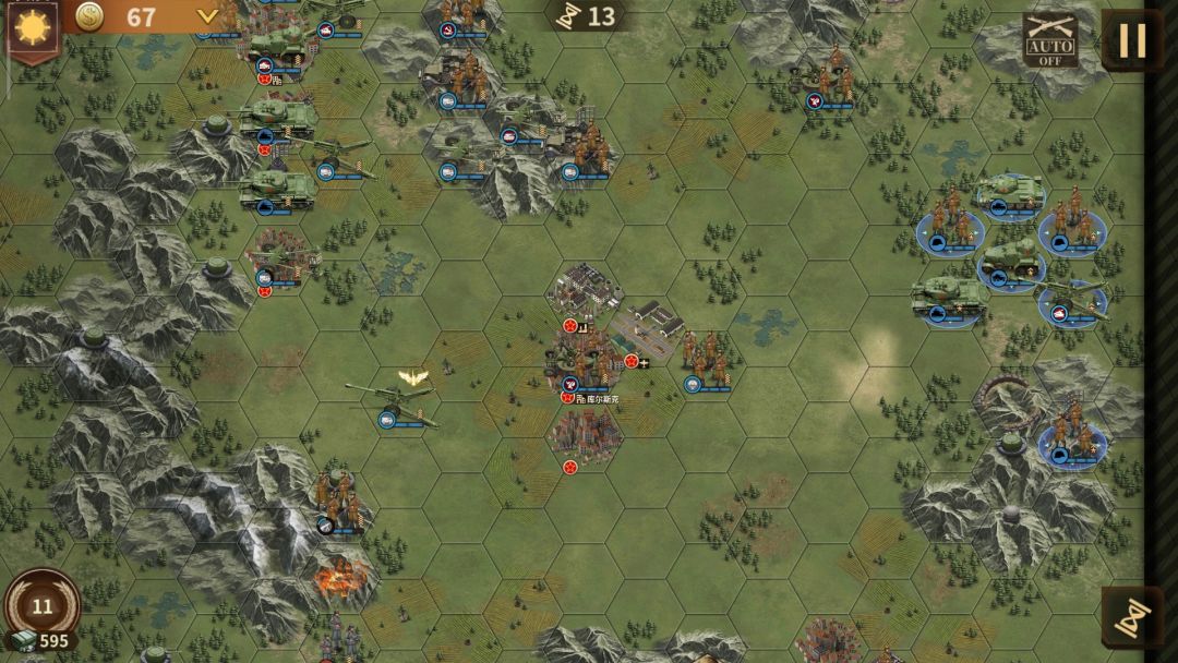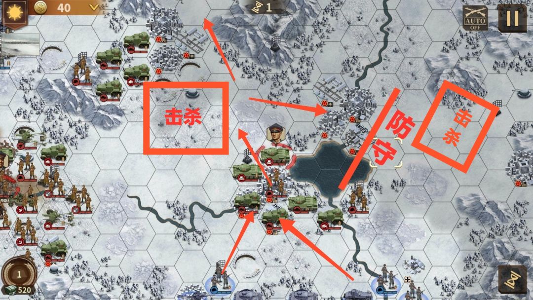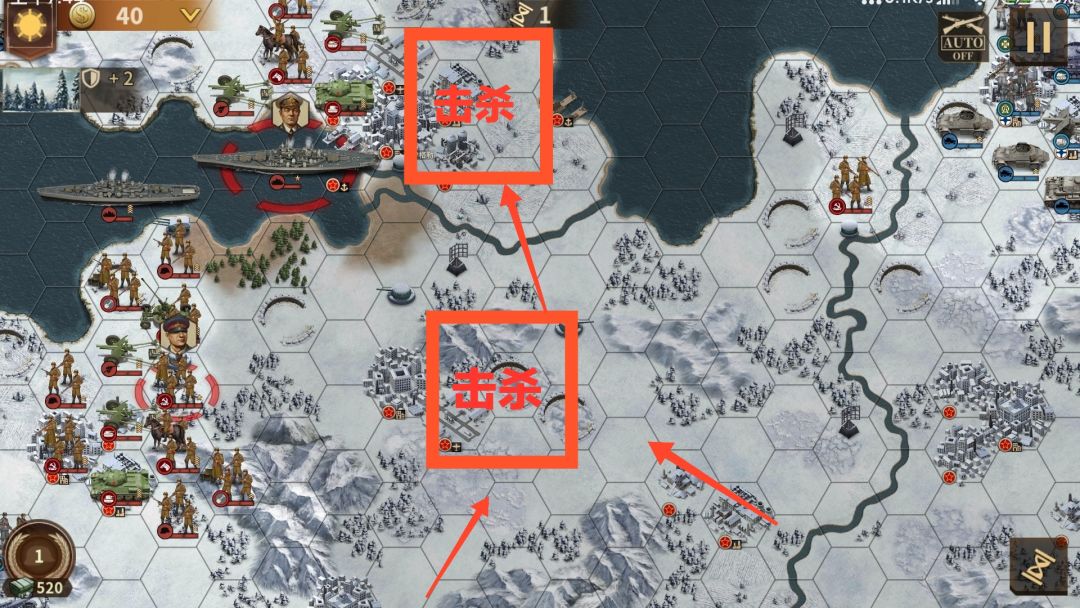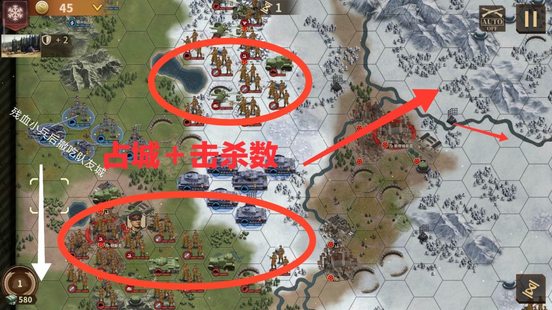 上下2路兵操控,关键目标位置看图,我这里就建议象式留在下面,上路用喀秋莎,队友朱可夫13回合会开始进攻敌军并且我们会得到部队援助,没什么特别的,占城之前还是注意小目标完成情况,提前胜利没杀够人还得重打,我是真的很容易忘记这个导致重来。