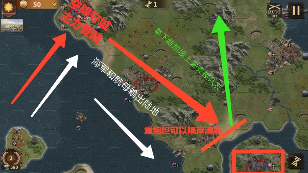 看图知敌方大概兵力,首先拿下机场城,海军上去轰吉隆坡,那里是没有防空的,清空城市就可以空降占城然后下方拿下第二个城市kv6喀秋莎可以直接渡海,下方留个坦将或者步将继续打红圈城就行。海军掩护主力部队推进,喀秋莎可以岸边轰新加坡守军。整体比较激烈的就是吉隆坡到新加坡的推进过程,新加坡的机场也能覆盖到右下角,拿下新加坡主力就可以往上去帮队友拿关丹。这里有2个空将是最好的,一个航母一个蹲机场。