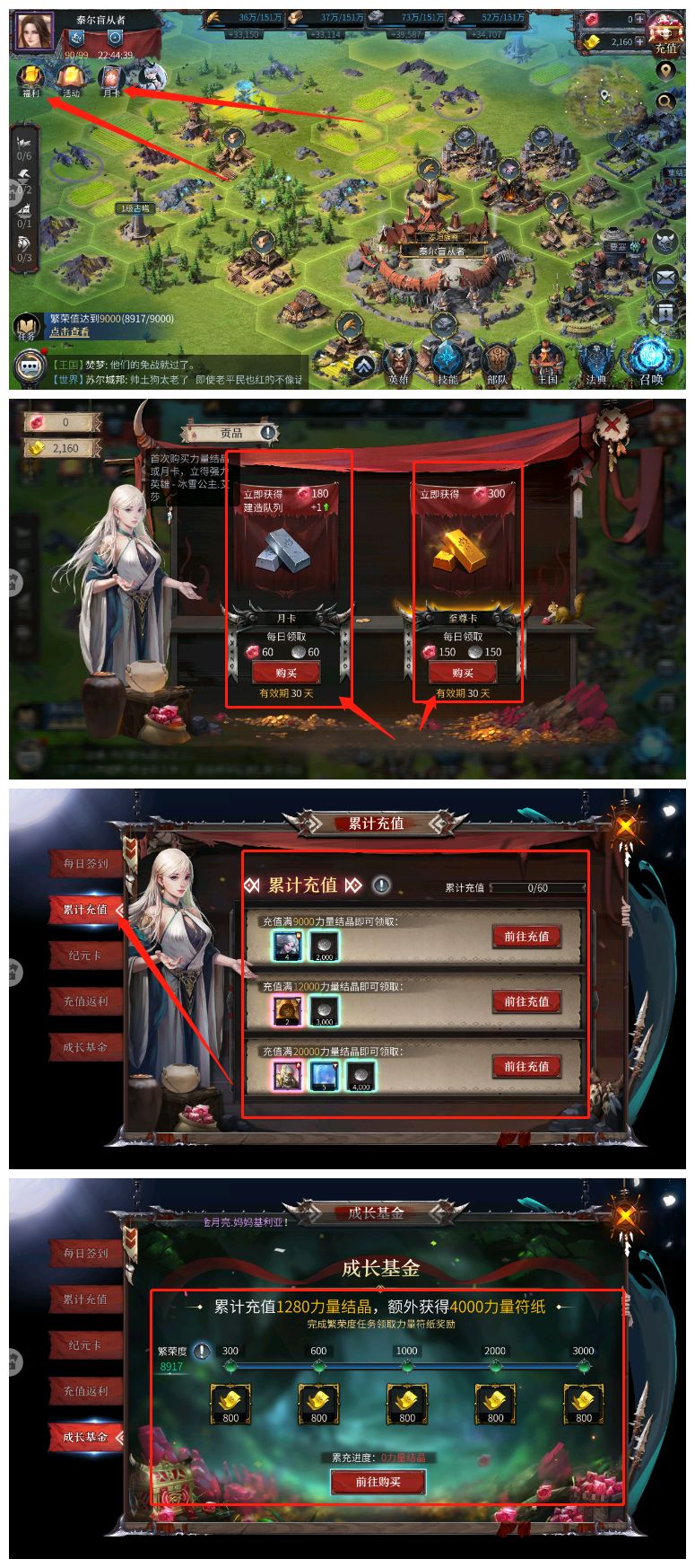 氪金大佬与微氪玩家相比无非是多了一项成长基金和两个双月卡清单,不过最明显的差距在于力量符纸每天领取的多少跟史诗级别的卡牌的差距,有的人就好奇了为什么会有紫卡的差距不是一样的嘛?福利里面是由一个累计充值的奖励