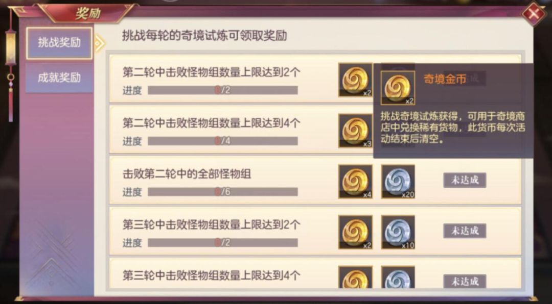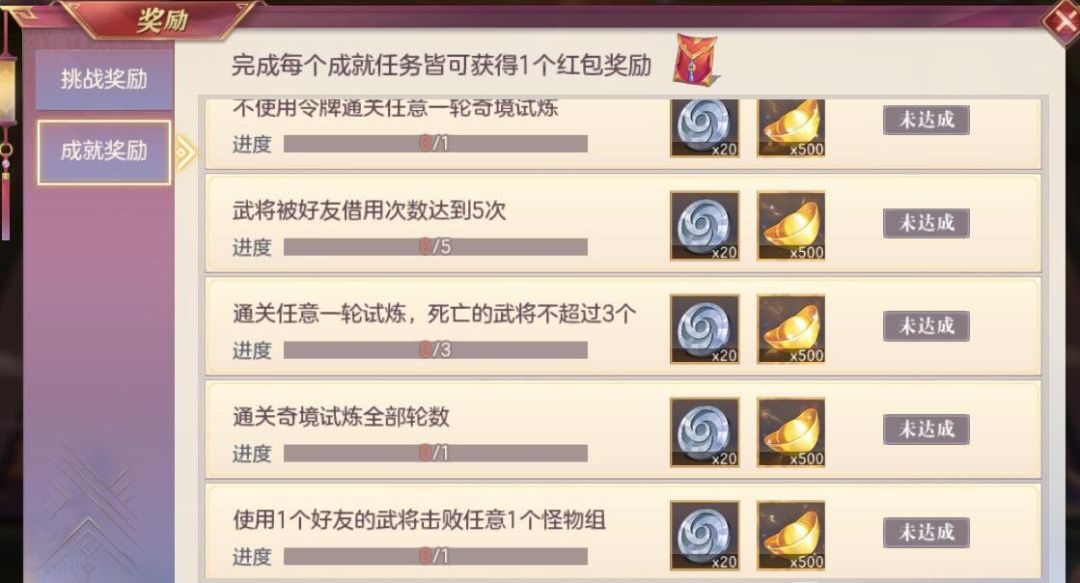 而成就奖励只需达成对应条件即可获得500/个的元宝奖励和500元宝10份的军团红包,是欧是非一摸便知~通过任务获得的金银币可以在即将开放的奇境商铺中兑换奖励,让我们一起期待一下吧~ 以上内容全部来源于测试服,仅供参考,具体内容请以正式服实际上线内容为准。最后祝各位小将军们看了我的前瞻都能轻松通关奇境试炼,获得丰厚奖励哦~