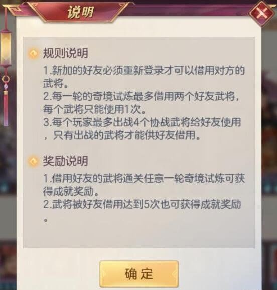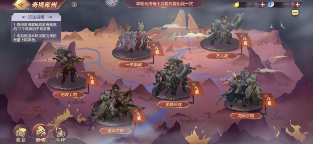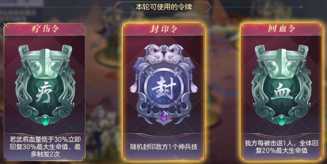 每轮挑战都可以选择两枚加成令牌(类似赤壁的令牌)来帮助战斗,也可以通过跟好友租借武将来通过关卡,每轮每个武将只能使用一次,比较考验卡池深度。
