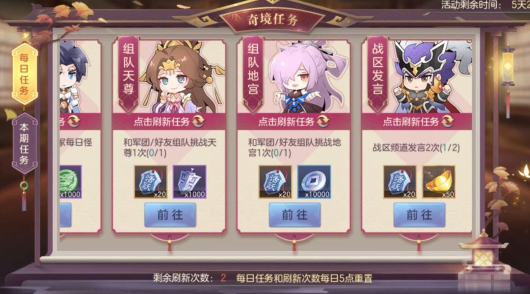 奇境之旅需要通过每日任务、本期任务来获得活跃度和奖励,每日任务都是我们日常需要完成的游戏内容,几乎没有难度。每日任务还可以免费刷新3次,可以换掉一些不太容易完成的内容,算是非常良心和人性化了。
