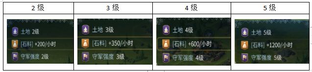 上面我是以石料的等级土地举的列可以明显的看见四级地与五级地生产量的差距,很多时候我们占着一、二、三级地不丢掉去多占五级地我们的生产量就会比别人少很多,所以一定要注意领地的等级剩下的资源获取还有几个地方大家可能没注意到